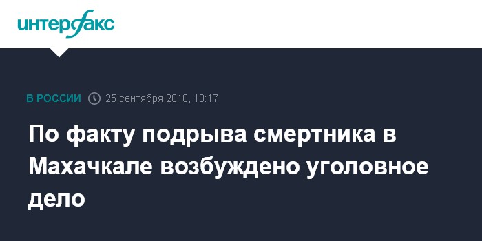 Москва. 25 сентября. INTERFAX.RU - Уголовное дело по двум статьям возбуждено по факту подрыва террориста-смертника в ночь на субботу в Махачкале. "Уголовное дело возбуждено по статьям 223 - "Незаконное изготовление оружия" и 317 - "Посягательство на жизнь сотрудника правоохранительного органа" Уголовного кодекса РФ", - сообщил "Интерфаксу" источник в правоохранительных органах. По уточненным данным, в результате нападения террориста пострадали 26 человек, сообщили ранее агентству "Интерфакс-Юг" в правоохранительных органах Дагестана.