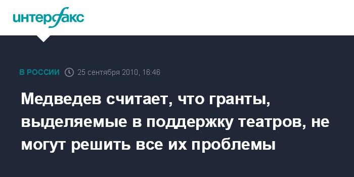 Горки. 25 сентября. INTERFAX.RU - Президент России Дмитрий Медведев считает, что гранты, выделяемые в поддержку театров, не могут решить все их проблемы. "Грантовое направление абсолютно правильное, - заявил он в субботу на встрече с деятелями российского театрального искусства. - Другое дело, что гранты не решают всех вопросов театров". Президент призвал театральных деятелей принять активное участие в выработке решения вопросов поддержки театров в малых городах.