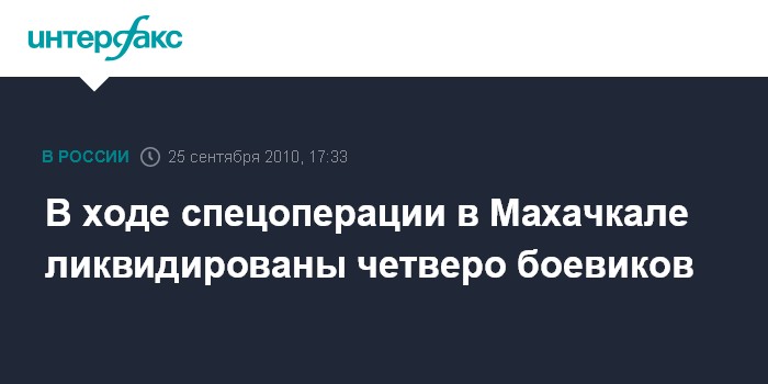 Махачкала. 25 сентября. INTERFAX.RU - Активная фаза спецоперации на улице Магистральной в Махачкале, которая началась 24 сентября, завершена, в общей сложности ликвидированы четверо боевиков, сообщили "Интерфаксу" в пресс-службе УФСБ России по Дагестану. "Двое боевиков были убиты сегодня при оказании вооруженного сопротивления, о ликвидации двоих стало известно еще вчера", - сказал собеседник агентства.