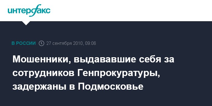 Москва. 27 сентября. INTERFAX.RU - В Подмосковье обезврежена группа злоумышленников, выдававших себя за сотрудников генеральной прокуратуры РФ, сообщил "Интерфаксу" источник в правоохранительных органах.