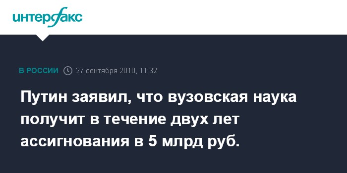 Москва. 27 сентября. INTERFAX.RU - В ближайшие два года на развитие вузовской науки будет выделено 5 млрд рублей, заявил премьер-министр РФ Владимир Путин.