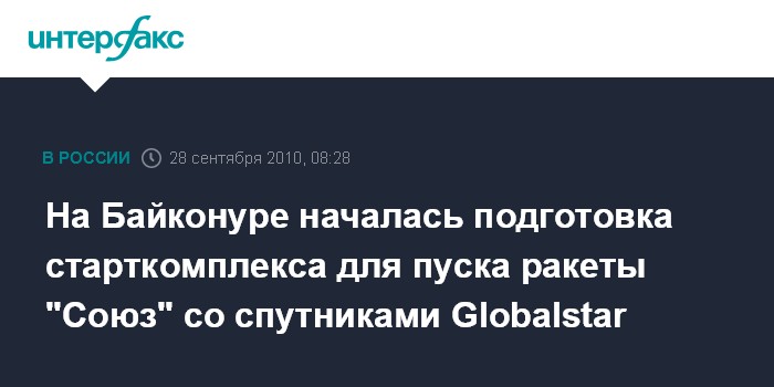 Байконур. 28 сентября. INTERFAX.RU - На площадке N31 Байконура расчеты космического центра "Южный" приступили к работам по подготовке стартового комплекса к запуску ракеты космического назначения "Союз-2-1А" с разгонным блоком "Фрегат" и шестью спутниками низкоорбитальной связи Globalstar, сообщил агентству "Интерфакс" во вторник источник на космодроме.