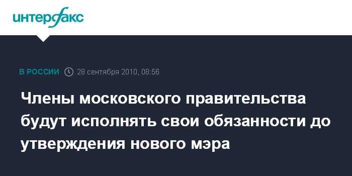 Москва. 28 сентября. INTERFAX.RU - Столичное правительство будет исполнять свои обязанности до момента, когда Мосгордума в установленном порядке утвердит кандидатуру нового московского градоначальника, внесенную президентом России, сообщил "Интерфаксу" во вторник информированный источник в мэрии.