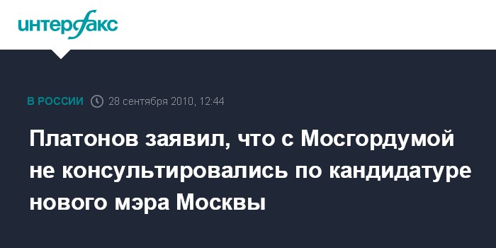 Москва. 28 сентября. INTERFAX.RU - Консультации по возможным кандидатурам нового мэра российской столицы с депутатами Мосгордумы не проводились, заявил спикер Мосгордумы Владимир Платонов.