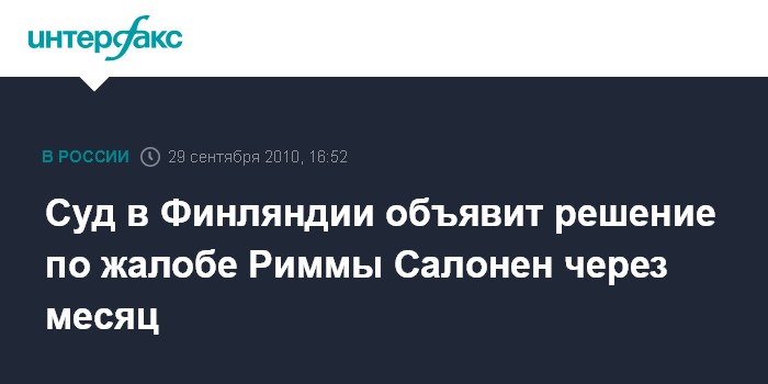 Хельсинки. 29 сентября. INTERFAX.RU - Окружной суд города Турку огласит вердикт по кассационной жалобе россиянки Риммы Салонен 28 октября, сообщила в среду "Интерфаксу" Салонен.
