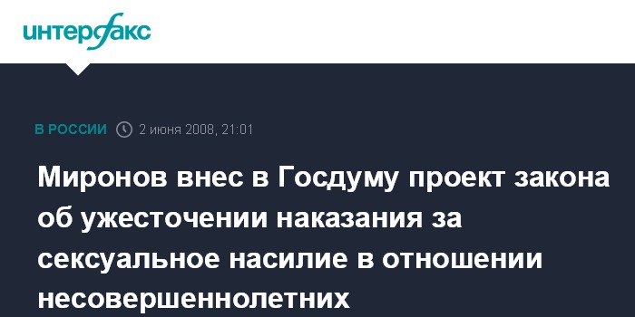 Москва. 2 июня. ИНТЕРФАКС - Спикер Совета Федерации РФ Сергей Миронов выступил с законодательной инициативой и направил в Госдуму законопроект, ужесточающий ответственность за преступления сексуального характера, совершенные в отношении несовершеннолетних.