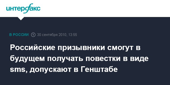 Москва. 30 сентября. INTERFAX.RU - В Генштабе Вооруженных сил РФ не исключают, что кроме традиционных повесток призывники скоро будут получать sms-сообщения с предложением явиться в военкомат.