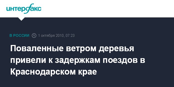 Москва. 1 октября. ИНТЕРФАКС - Движение поездов на участке Сочи - Дагомыс в Краснодарском крае в четверг было прервано на несколько часов из-за упавших на железнодорожные пути деревьев, сообщает в пятницу пресс-служба Северо-Кавказской железной дороги (СКЖД).