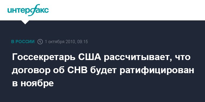 Вашингтон. 1 октября. INTERFAX.RU - Госсекретарь США Хиллари Клинтон выразила надежду на то, что российско-американский договор об СНВ будет ратифицирован после выборов в сенат в ноябре.