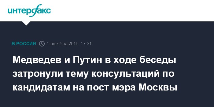Горки. 1 октября. INTERFAX.RU - Президент РФ Дмитрий Медведев и премьер Владимир Путин в ходе рабочей встречи в пятницу затронули вопрос о начале консультаций партии "Единая Россия" по формированию списка кандидатов на должность мэра Москвы, сообщила журналистам пресс-секретарь президента Наталья Тимакова.