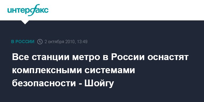Ногинск (Московская область). 2 октября. INTERFAX.RU - Метрополитены семи российских мегаполисов в ближайшее время будут оборудованы комплексными системами безопасности, сообщил глава МЧС России Сергей Шойгу. "Мы начали технологические работы в метрополитене. Я думаю, что с использованием опыта, в том числе и наших европейских коллег, мы в ближайшее время покажем первые две станции метро, которые будут оборудованы комплексной системой безопасности", - сказал он, отвечая в субботу на вопрос журналистов.