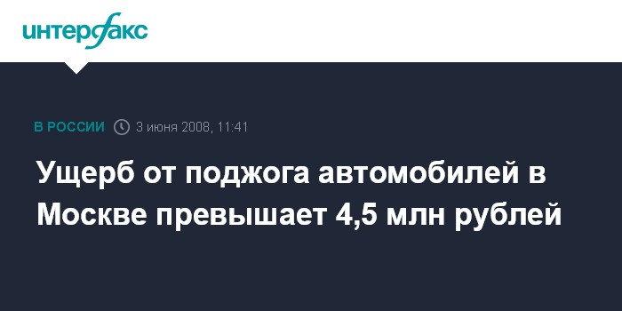 Москва. 3 июня. INTERFAX.RU - Ущерб от поджога автомобилей в Москве, по предварительным данным, составляет как минимум 4,5-7 млн руб., сообщили "Интерфаксу" представители крупнейших российских страховых компаний.