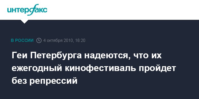 Санкт-Петербург. 4 октября. INTERFAX.RU - Организаторы международного ЛГБТ-кинофестиваля "Бок о бок", который должен пройти в северной столице с 15 по 23 октября, надеются, что городские власти не будут препятствовать сексменьшинствам в проведении мероприятия.