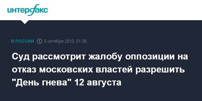 Москва. 5 октября. ИНТЕРФАКС - Тверской суд Москвы во вторник продолжит рассмотрение жалобы организаторов оппозиционной акции "День гнева" на отказ столичных властей согласовать проведение 12 августа мероприятия напротив мэрии города.