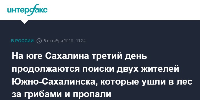 Южно-Сахалинск. 5 октября. ИНТЕРФАКС-ДАЛЬНИЙ ВОСТОК - Сахалинские спасатели продолжают поиск двух жителей Южно-Сахалинска, которые в воскресенье пропали в лесу в Корсаковском районе, сообщили агентству "Интерфакс - Дальний Восток" в пресс-службе ГУ МЧС по Сахалинской области.