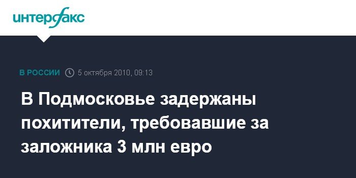 Москва. 5 октября. INTERFAX.RU - В Подмосковье из плена освобожден предприниматель, похитители которого требовали выкуп в 3 млн евро, сообщил "Интерфаксу" источник в правоохранительных органах.