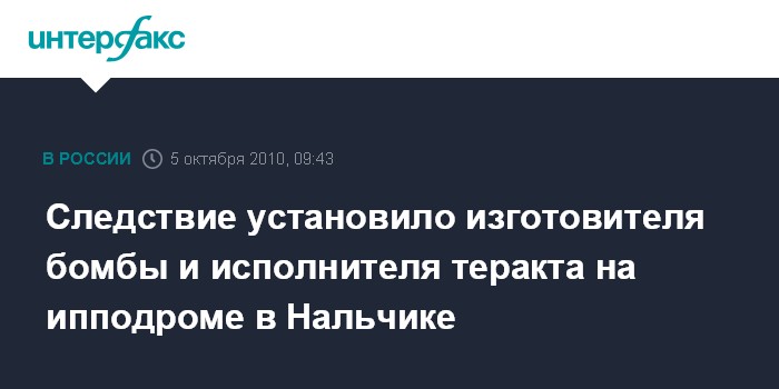 Москва. 5 октября. INTERFAX.RU - Следственный комитет России (СКР) установил личность изготовителя взрывного устройства и исполнителя теракта на ипподроме в Нальчике в мае 2010 года, сообщил официальный представитель СКР Владимир Маркин.