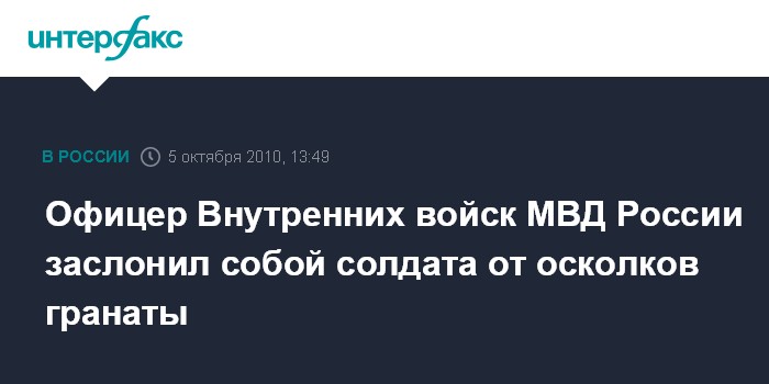 Москва. 5 октября. ITNERFAX.RU - Подполковник Александр Макаренко получил множественные осколочные ранения, заслонив подчиненного от взрыва ручной гранаты во время занятий, сообщил "Интерфаксу-АВН" во вторник начальник пресс-службы Внутренних войск МВД России полковник Василий Панченков.