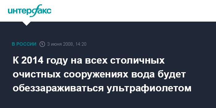 Москва. 3 июня. INTERFAX.RU - До 2014 г. технология очистки сточных вод ультрафиолетом будет внедрена на всех очистных сооружениях Москвы, сообщили "Интерфаксу" в пресс-службе Мосводоканала сегодня.
