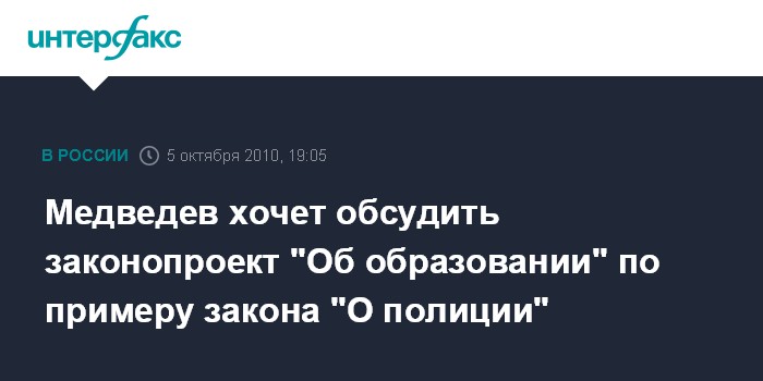 Москва. 5 октября. INTERFAX.RU - Президент России Дмитрий Медведев поручил министерству образования и науки провести общественные обсуждения нового законопроекта "Об образовании". Это поручение глава государства дал во время встречи с лауреатами конкурса "Учитель года-2010".