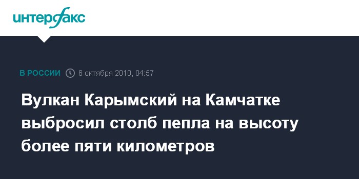 Петропавловск-Камчатский. 6 октября. ИНТЕРФАКС-ДАЛЬНИЙ ВОСТОК - Вулкан Карымский, извергающийся на Камчатке, выбросил столб пепла с газом на высоту 5 тыс. 100 метров над уровнем моря.