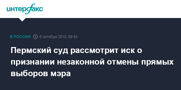 Пермь. 6 октября. INTERFAX.RU - В Ленинском районном суде Перми в среду начнутся основные слушания по иску пермских правозащитников, которые требуют признать незаконной отмену всенародных выборов главы города.
