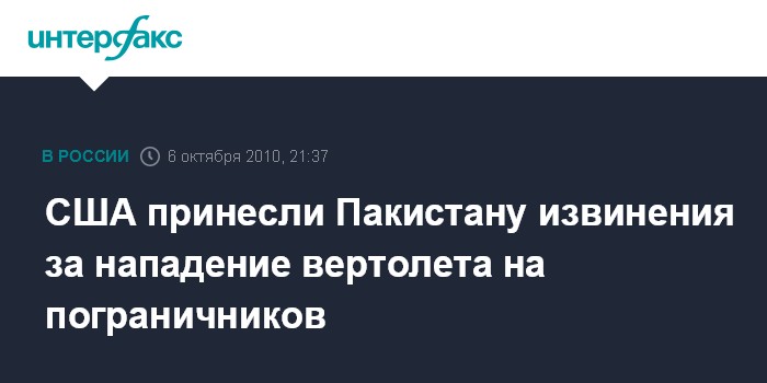 Лондон. 6 октября. INTERFAX.RU - Посланник США в Пакистане Энн Паттерсон принесла извинения пакистанскому правительству в связи с недавней атакой вертолета сил НАТО, в результате которой на границе Пакистана с Афганистаном погибли несколько пакистанских военнослужащих, сообщает в среду британская телерадиокорпорация BBC.