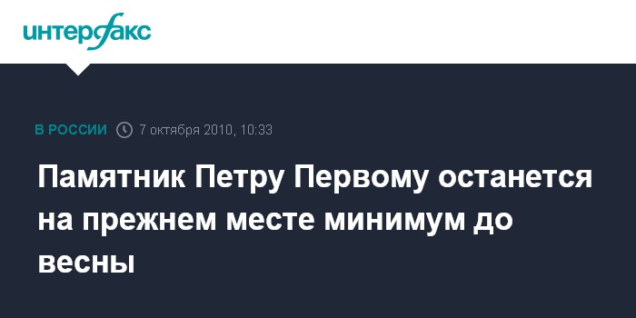 Москва. 7 октября. INTERFAX.RU - Работы по демонтажу и переносу памятника Петру Первому на стрелке Обводного канала и Москвы-реки скульптора Зураба Церетели начнутся не раньше весны-лета 2011 года, сообщил "Интерфаксу" источник в руководстве Москомархитектуры в четверг.