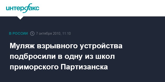 Владивосток. 7 октября. INTERFAX.RU - ДАЛЬНИЙ ВОСТОК - Учебные занятия в одной из школ приморского города Партизанска в четверг были прерваны из-за обнаружения в школьном туалете предмета, похожего на самодельное взрывное устройство.