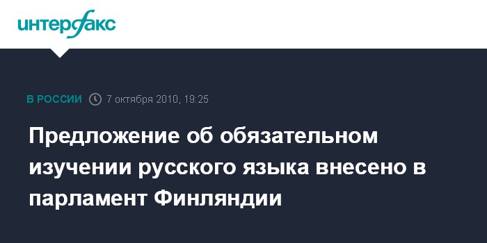 Хельсинки. 7 октября. INTERFAX.RU - Председатель фракции Левого союза Финляндии Анника Лапинтие (Annika Lapintie) внесла в четверг на рассмотрение в Парламент предложение сделать русский язык обязательным для изучения в школах Восточной Финляндии.