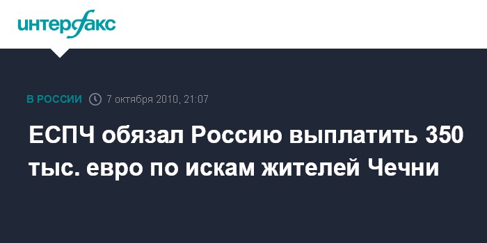 Страсбург. 7 октября. INTERFAX.RU - Европейский суд по правам человека постановил, что Россия должна выплатить около 350 тыс. евро по искам родственников двух уроженцев Чечни Хамзата Мержоева и Али Гастамирова, пропавших без вести, а также пенсионера из Чечни Алаудина Садыкова, подвергшегося пыткам в 2000 г., говорится в пресс-релизе суда, распространенном в четверг.