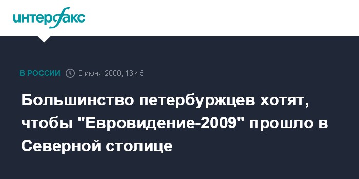 Москва. 3 июня. INTERFAX.RU - Жители Петербурга в целом положительно относятся к идее проведения конкурса "Евровидение-2009" в городе на Hеве. Согласно социологическому опросу, проведенному Агентством социальной информации, желающих видеть финал в Петербурге оказалось 58,9%, 17% высказываются за проведение конкурса в Москве, 6,5% - за другой город.
