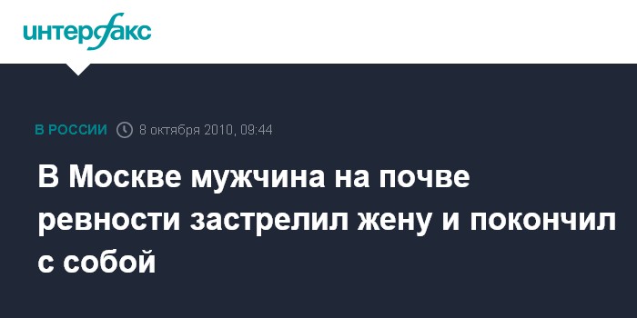 Москва. 8 октября. INTERFAX.RU - В Москве в доме 42 по 11-й Парковой улице на почве ревности 44-летний мужчина застрелил 26-летнюю жену, сообщил "Интерфаксу" источник в правоохранительных органах.