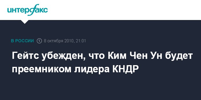 Вашингтон. 8 октября. INTERFAX.RU - Глава министерства обороны США Роберт Гейтс выразил уверенность в том, что лидер КНДР Ким Чен Ир в любой момент может передать власть в стране своему младшему сыну Ким Чен Уну, сообщило в пятницу агентство ЭФЭ.