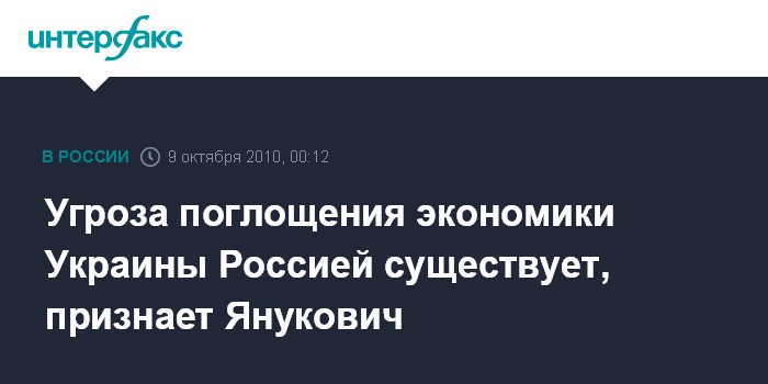 Киев. 9 октября. ИНТЕРФАКС-УКРАИНА - Президент Украины Виктор Янукович признает наличие угрозы поглощения украинской экономики Россией.