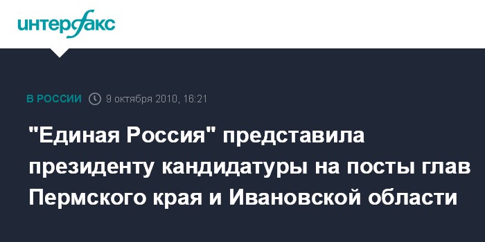 Горки. 9 октября. INTERFAX.RU - "Единая Россия" представила президенту кандидатуры на посты руководителей Пермского края и Ивановской области. Как сообщил председатель Высшего совета "Единой России" Борис Грызлов, на пост главы Пермского края предлагаются Игорь Руденский - депутат Госдумы, Геннадий Тушнолобов - руководитель фракции "Единой России" в законодательном собрании Пермского края, замгендиректора компании "ЛУКОЙЛ-Пермь" и действующий глава региона Олег Чиркунов.