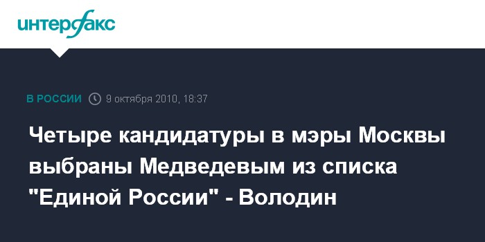 Москва. 9 октября. INTERFAX.RU - В руководстве "Единой России" утверждают, что кандидатуры на пост мэра Москвы - это, в первую очередь, выбор президента РФ Дмитрия Медведева. "Дмитрий Анатольевич из первоначального списка, сформированного в ходе консультаций с московской городской организацией партии и фракцией "Единая Россия" в Мосгордуме, остановился на четырех кандидатурах", - заявил журналистам в субботу секретарь президиума Генсовета партии, вице-спикер Госдумы Вячеслав Володин.