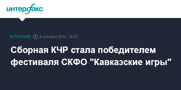 Хабез (КЧР). 9 октября. INTERFAX.RU - Сборная Карачаево-Черкесии признана победителем в общекомандном зачете первого спортивного фестиваля Северо-Кавказского федерального округа "Кавказские игры", проходящего в КЧР. По итогам фестиваля Карачаево-Черкесия в качестве приза получит средства на строительство объекта спортивной и культурной направленности на территории субъекта, передает корреспондент агентства "Интерфакс-Юг" с места событий. Кроме того, следующий фестиваль, который состоится в 2011 году, опять пройдет в КЧР.