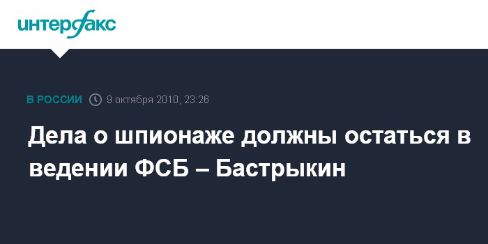"Я думаю, что дела о шпионаже должны остаться в ведении ФСБ. У них огромная практика, хороший опыт оперативно-розыскной деятельности", - заявил А.Бастрыкин в эфире радиостанции "Эхо Москвы" в субботу вечером.