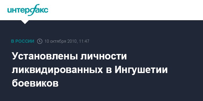 Назрань. 10 октября. INTERFAX.RU - Личности двух боевиков, уничтоженных в ходе спецоперации в Ингушетии, установлены, сообщили в пресс-службе ФСБ РФ. "Один из них предварительно опознан как Илез Дауберков, 1983 г.р., другим предположительно является Алисхан Кузигов", - говорится в сообщении ФСБ РФ, поступившем в "Интерфакс" в воскресенье.