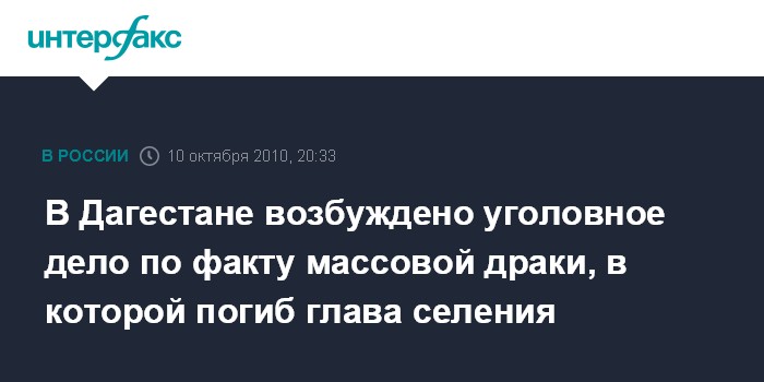 Махачкала. 10 октября. ИНТЕРФАКС-ЮГ - По факту массовой драки в селении Хаджалмахи Левашинского района Дагестана, в которой был убит глава села Абдулмуслим Нурмагомедов и получили ранения два человека, возбуждено уголовное дело.