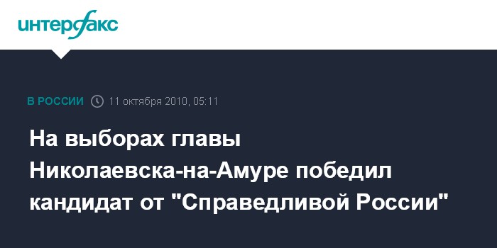 Хабаровск. 11 октября. ИНТЕРФАКС - ДАЛЬНИЙ ВОСТОК - Генеральный директор ООО "Частный ЖЭК" Петр Волынский, выдвинутый партией "Справедливая Россия", одержал победу на выборах главы города Николаевска-на-Амуре Хабаровского края.