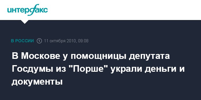 "В 20:35 в дежурную часть обратилась 28-летняя женщина - помощник на общественных началах депутата Госдумы Виктора Абрамова, которая рассказала, что у дома 14 по Большой Дорогомиловской улице к ее припаркованному автомобилю "Порше 911 Тарго" подошли двое неизвестных и похитили из салона сумку", - рассказал собеседник агентства.