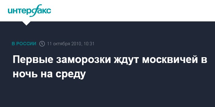 Москва. 11 октября. INTERFAX.RU – Первые заморозки ожидают Москву в ночь на среду, сообщают "Метеоновости". В понедельник и вторник дневные и ночные температуры будут держаться выше нуля: +2..6 днем и +3 в новь на вторник. Вечером во вторник температура начнет снижаться, ночью ожидается +2..-2 градуса.