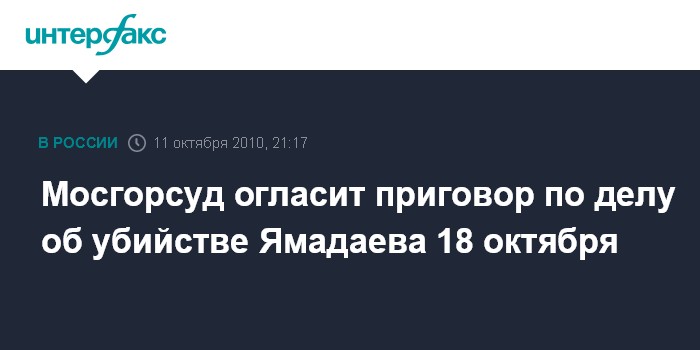 Москва. 11 октября. INTERFAX.RU - Приговор по делу об убийстве бывшего депутата Госдумы Руслана Ямадаева Мосгорсуд вынесет через неделю.