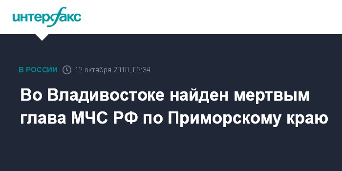 Владивосток. 12 октября ИНТЕРФАКС - ДАЛЬНИЙ ВОСТОК - Глава МЧС РФ по Приморью Николай Тимошенко во вторник утром найден мертвым возле квартиры дома, где он проживал.