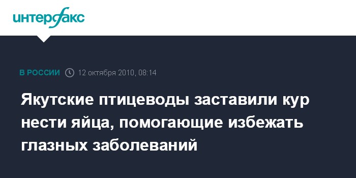 Якутск. 12 октября. INTERFAX.RU - Якутская птицефабрика начала выпуск яиц под названием "Молодость глаз" с высоким содержанием каротиноидов для профилактики глазных заболеваний, сообщает министерство сельского хозяйства республики.