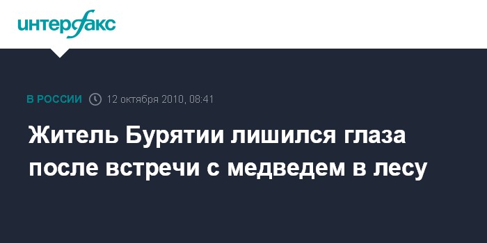Чита. 12 октября. INTERFAX.RU - В Бичурском районе Бурятии медведь напал на местного жителя, оставив его без глаза, сообщил агентству "Интерфакс" во вторник ведущий специалист по делам ГО и ЧС районной администрации Семен Утенков.