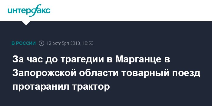 Запорожье. 12 октября. INTERFAX.RU - За час до дорожно-транспортного происшествия в Марганце (Днепропетровская обл.), в котором погибло более 40 чел., в Запорожском районе соседней Запорожской области на том же участке железной дороги "Кривой Рог - Запорожье" товарный поезд протаранил трактор, в результате чего тракторист погиб.