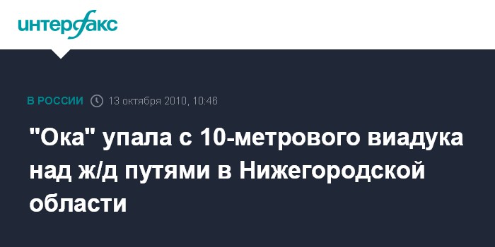 Нижний Новгород. 13 октября. INTERFAX.RU - В городе Арзамас Нижегородской области во вторник легковая автомашина упала с виадука, проходящего над железнодорожными путями, в результате чего погиб престарелый водитель.